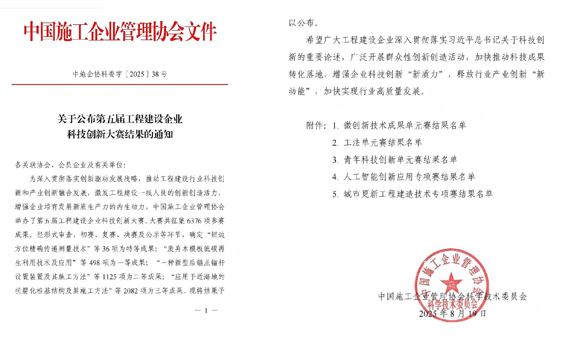 近日,第五屆全國(guó)工程建設(shè)企業(yè)科技創(chuàng)新大賽獲獎(jiǎng)結(jié)果出爐,集團(tuán)在“青年科技創(chuàng)新單元賽”中斬獲一等成果,在“工法單元賽”中獲得二等工法2項(xiàng), 三等工法1項(xiàng)。···